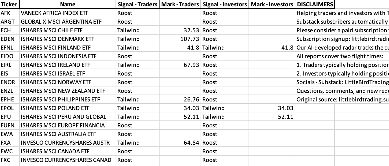 Our radar tracks the current Tailwinds (longs/buys) and Headwinds (shorts/sells) of 100+ assets to spot a potential launch point (Mark), or to wait (Roost) for a clearer flight path.