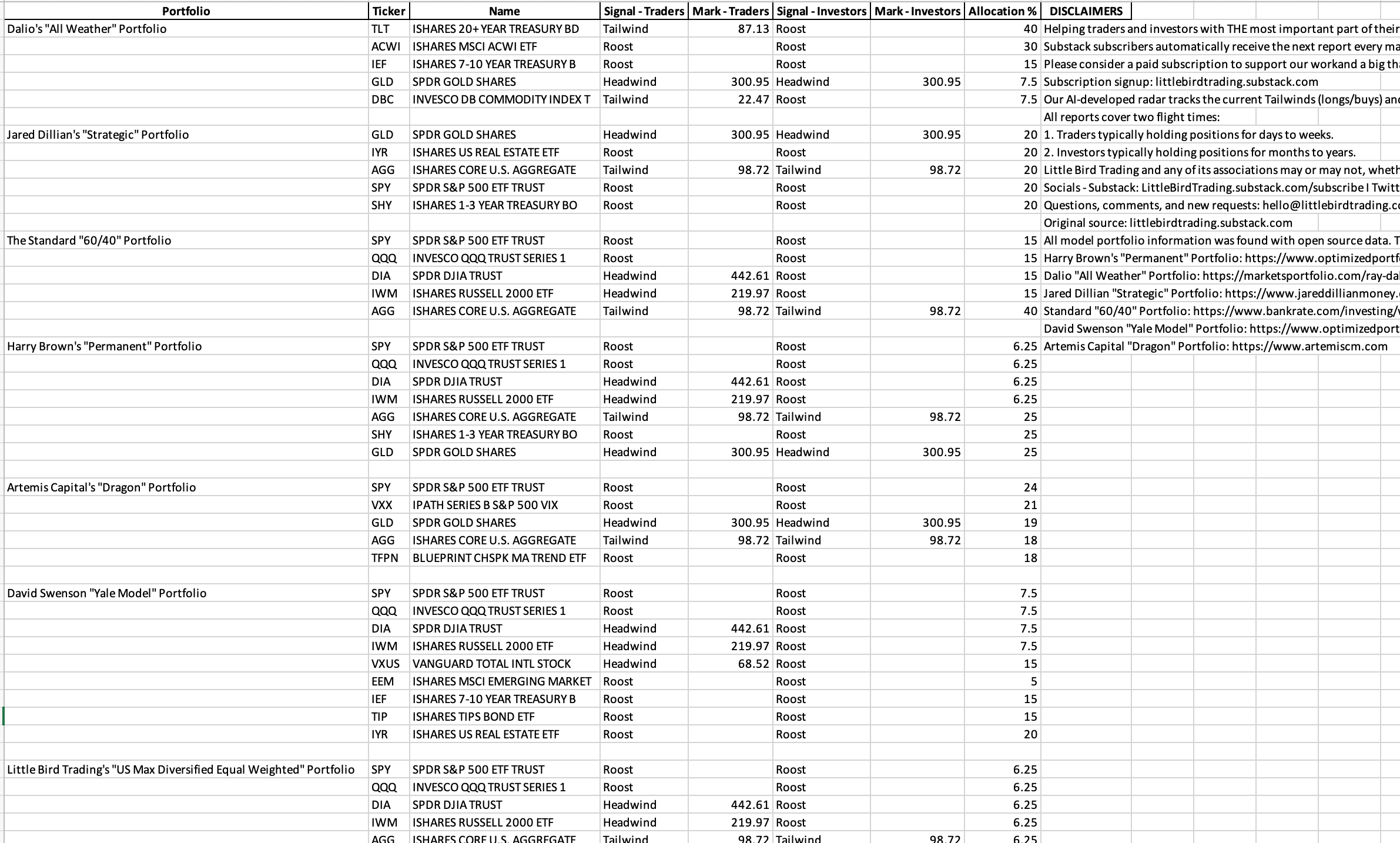 Unlike the markets, we’re offering a risk-free setup. Not sure yet about Little Bird Trading? Please use the 7-day FREE trial button to view everything behind the paywall.Disclaimer: Little Bird Trading and any of its associations may or may not, whether long or short, have a position in any instruments. Not investment advice. Provided for informational purposes only. Not a recommendation or endorsement. Not registered or licensed. Model portfolios are property of their respective owners. All data is sourced from publicly available information. No guarantee is being made or offered. Not responsible for financial loss or ruin.
