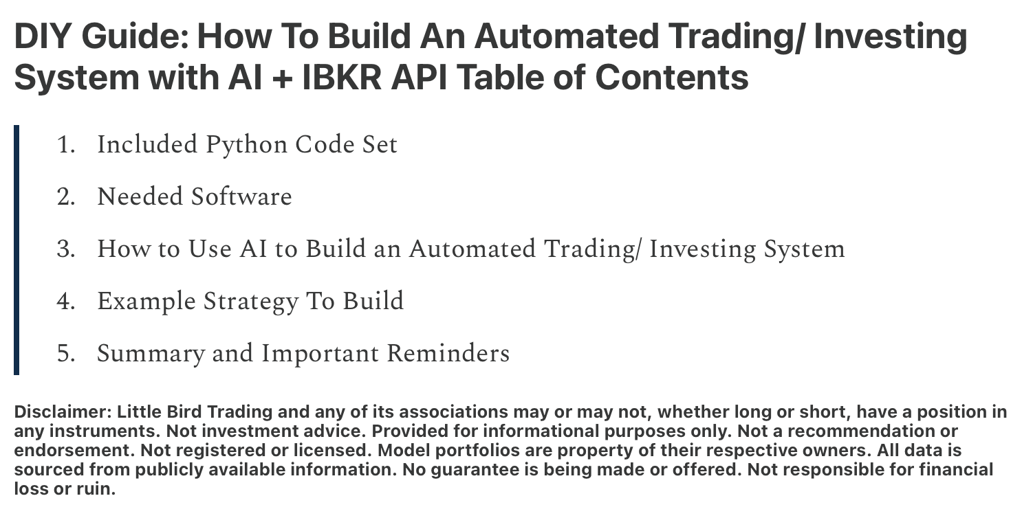 Disclaimer: Little Bird Trading and any of its associations may or may not, whether long or short, have a position in any instruments. Not investment advice. Provided for informational purposes only. Not a recommendation or endorsement. Not registered or licensed. Model portfolios are property of their respective owners. All data is sourced from publicly available information. No guarantee is being made or offered. Not responsible for financial loss or ruin. Little Bird Trading may earn an affiliate commission if you purchase through links on the site.