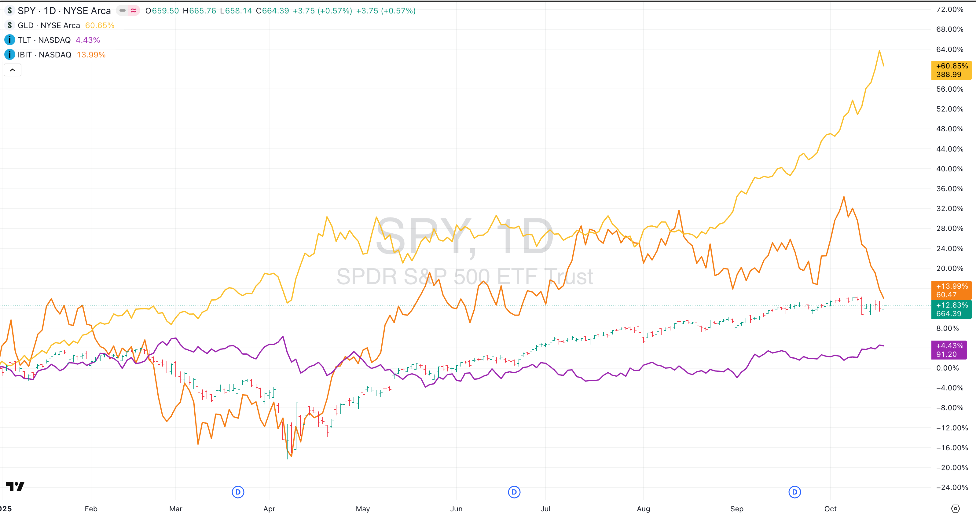 Let’s take a look at the market (SPY) and how the most popular hedges - gold (GLD), the long bond (TLT), and Bitcoin (IBIT) - are looking so far.